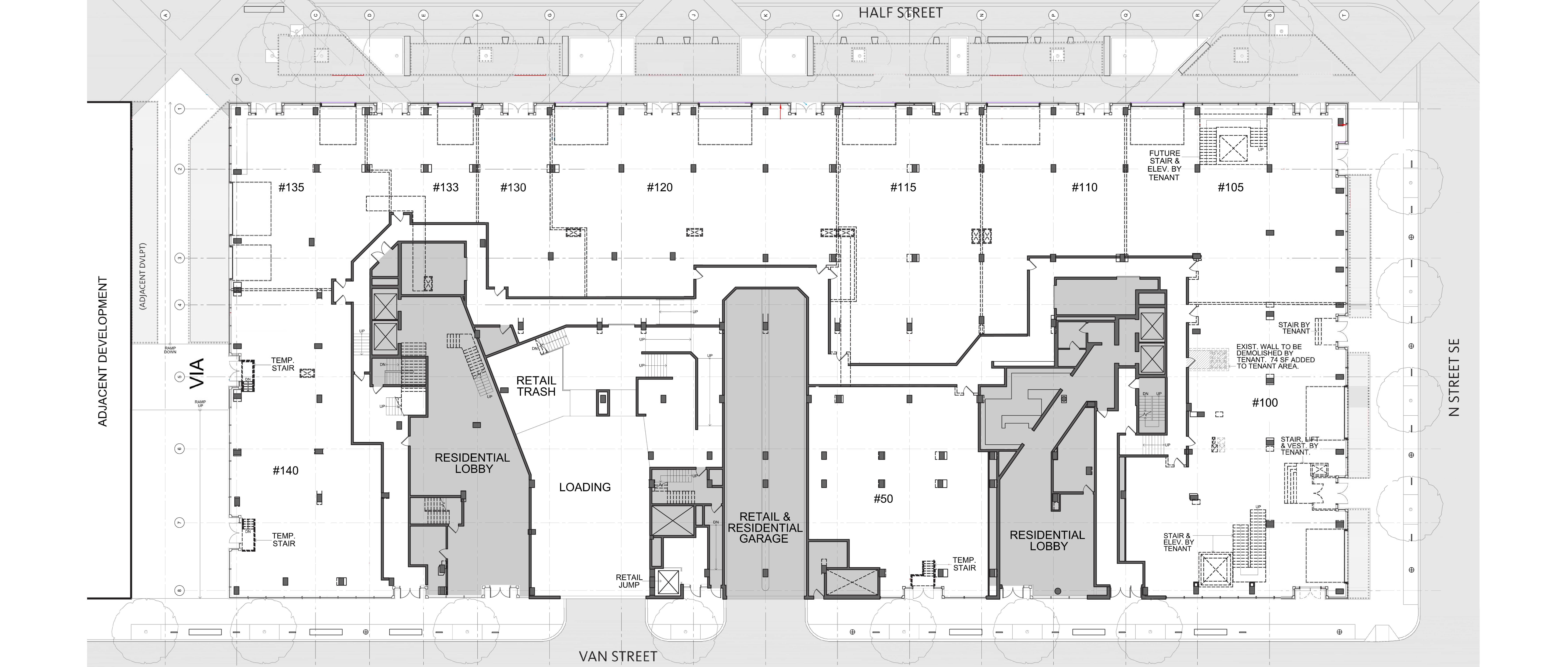 Overlooking Nationals Park in Washington, DC, West Half features 465 luxury residential units, ground and second floor retail space and three stories of below grade parking. The building’s striking profile responds to both solar orientation and views of Nationals Park immediately to the South. Because no two floors are alike, the project presented unique and challenging conditions for the retail infrastructure and venting strategy. A substantial portion of the retail façade was designed with curbless operable façade to take full advantage of the curbless street condition, which converts to a pedestrian only promenade during game days. The seamless transition from interior to exterior at the retail level allows venues to spill out into the street and contribute to the energy of the place.